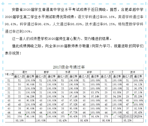 安徽省2020屆學生普通高中學業水平考試成績于近日揭曉。據悉,金年会2020屆學生高二學業水平測試取得優異成績:語文學科通過率98.16%,英語學科通過率98.43%,科學通過率98.43%,人文通過率98.69%,技術通過率95.25%,特别是數學學科通過率達到100%。